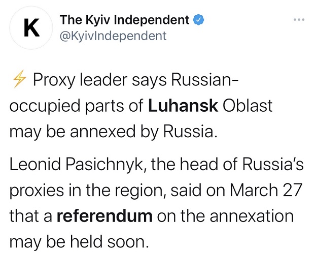 FX168财经报社(香港)讯 乌克兰东部的卢甘斯克地区当地媒体周日(3月27日)最新报道称,“卢甘斯克人民共和国”领导人帕谢奇尼克(Leonid Pasechnik)称,该“共和国”可能很快就是否加入俄罗斯举行公投。