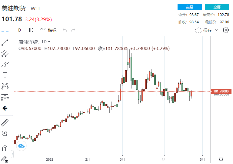 截至发稿,美国WTI原油期货上行3.08美元,涨幅3.12%,现报101.68美元/桶;布伦特原油期货上探2.94美元,涨幅2.87%,报105.40美元/桶。