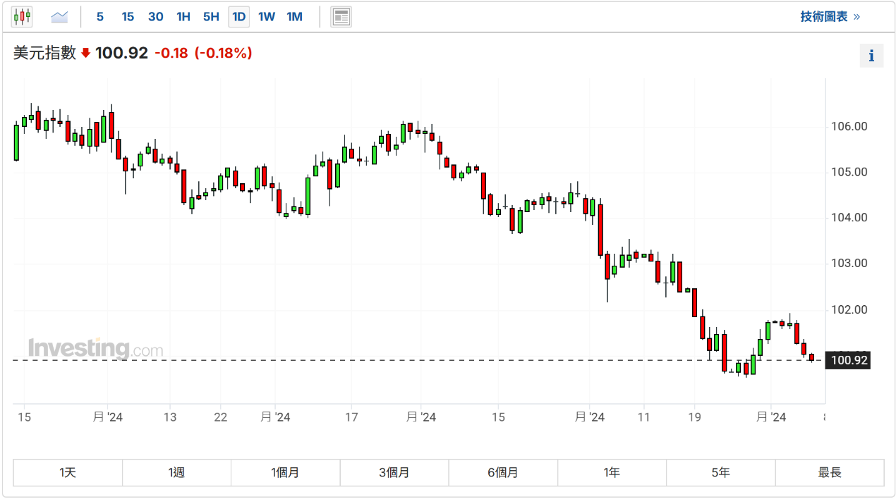美元指数跌破101关口,日内跌0.18%,盘中创逾一周新低。美联储9月份大幅降息预期重燃和疲软就业数据的打压下,美元指数近期持续走软。