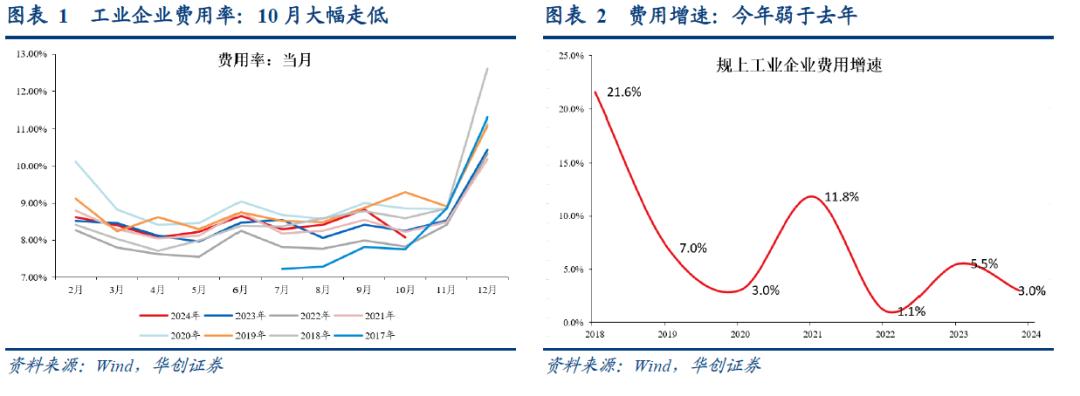 业增加值 10 月增速为 5.3% , 9 月为 5.4% ;收入端 10 月增速为 0.2% , 9 月为 0% 。利润率方面, 10 月为 5.44% ,去年同期(可比口径)为 6.09% 。利润率拆分来看, 10 月毛利率为 14.5% ,去年同期为 15.4% ;费用率为 8.08% ,去年同期为 8.25% ;其他损益收入比为 0.97% ,去年同期为 0.96% 。