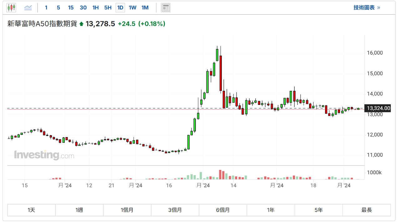 富时中国A50指数期货现升0.18%,盘中震荡运行。