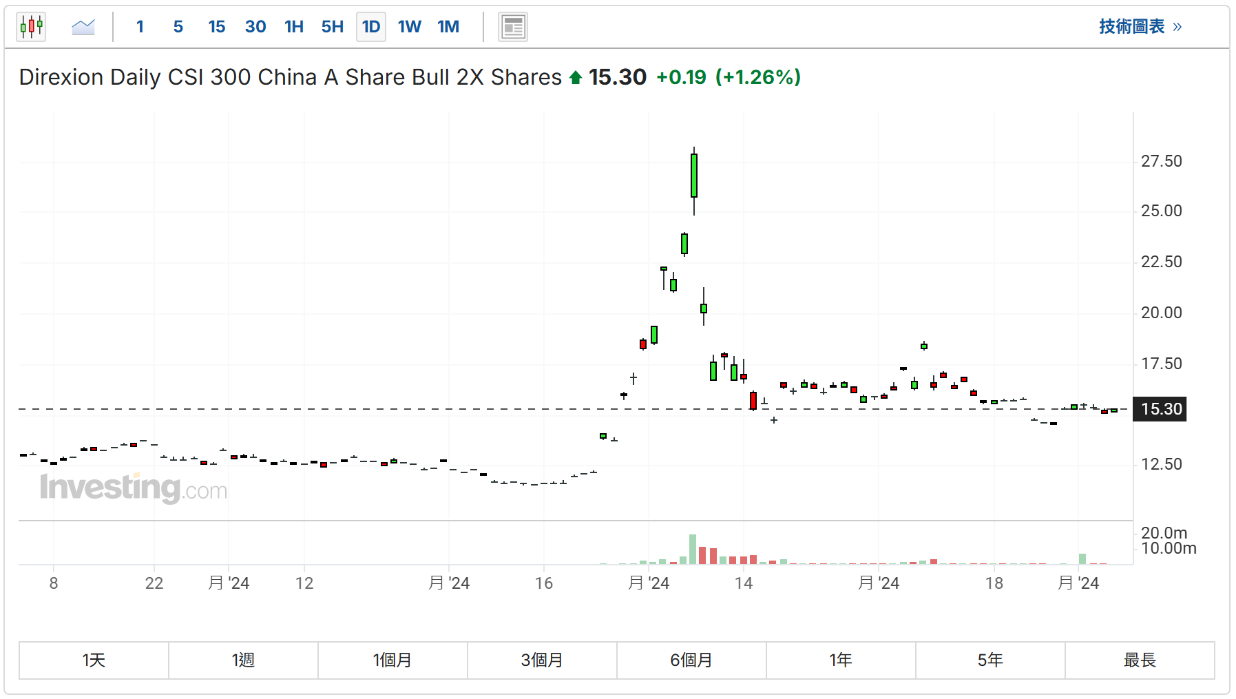 Direxion Daily CSI 300 China A Share Bull 2X Shares (NYSE:CHAU)现升1.26%。数据显示,本周一,有超过20万份Direxion Daily CSI 300 China A Share Bull 2X Shares(代码为CHAU)看升期权被买入。该ETF两倍做多于沪深300指数。按每份约2.64美元的合约平均价格计算,该笔交易总计斥资了5500万美元。
