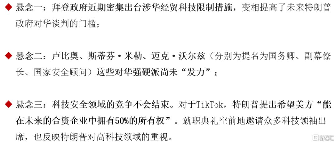但中长期上,需注意中美关系仍将在曲折中发展。一是特朗普行事风格素来多变,二是特朗普的人事和部门安排,或给日后的外交举措的转变埋伏笔,科技安全领域的竞争不会结束。
