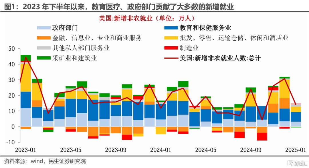 但联邦裁员的“外溢效应”不可忽视。首先,联邦政府裁员可能带动州政府、地方政府缩编;而政府总体占非农就业的比重较大。另外,私人部门就业也会受影响,教育和医疗行业首当其冲;而联邦政府(FDA、EPA、NIH等部门)减支,对外合同和订单减少,将导致联邦承包商失业,影响扩散至制造业。