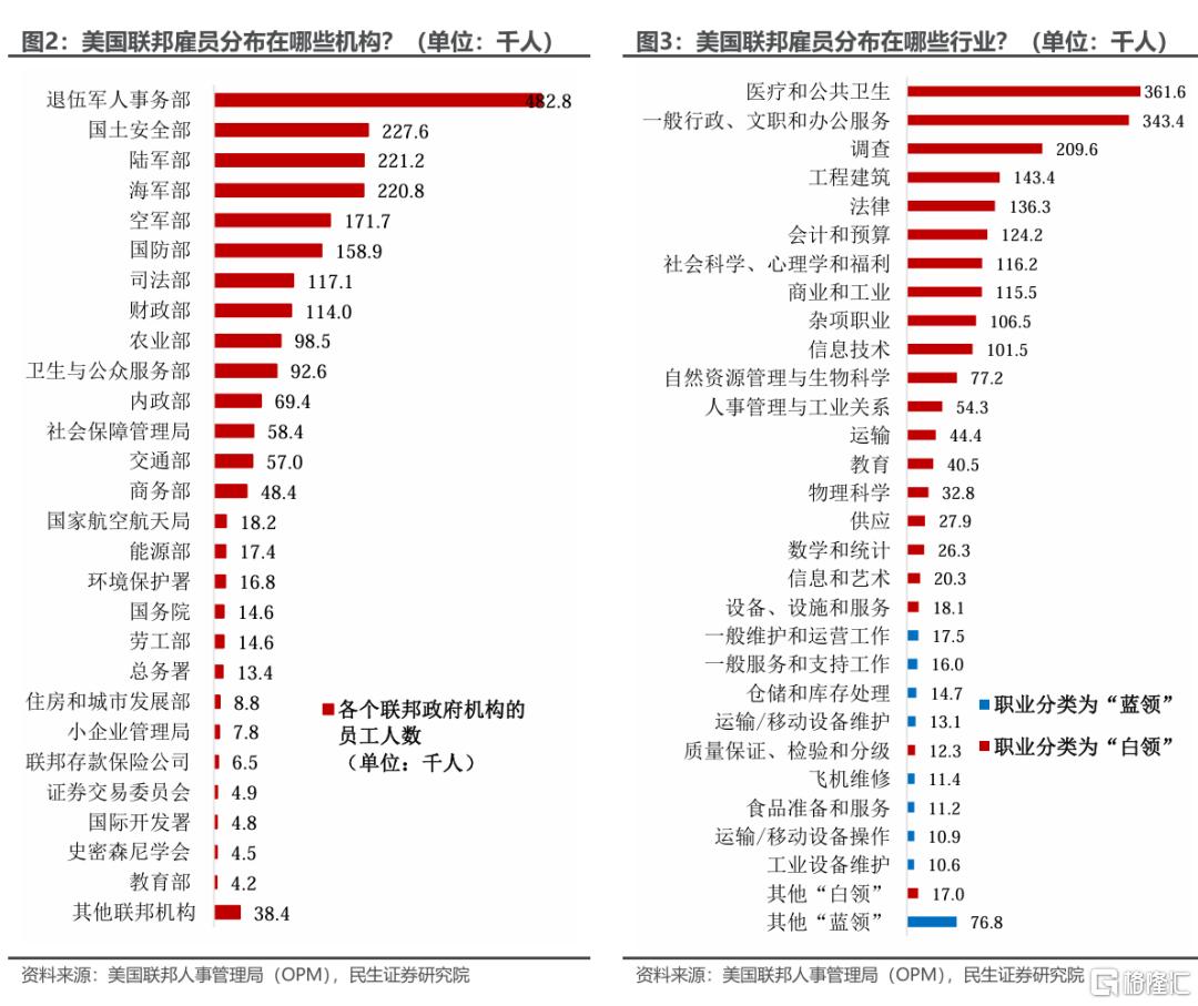 1)大部分人集中在少数机构部门。85%的联邦员工集中在11个部门。其中,退伍军人事务部的员工最多(48.3万人),该部门计划裁员8万人;其次是国安部、陆军部和海军部,人数均超过20万。