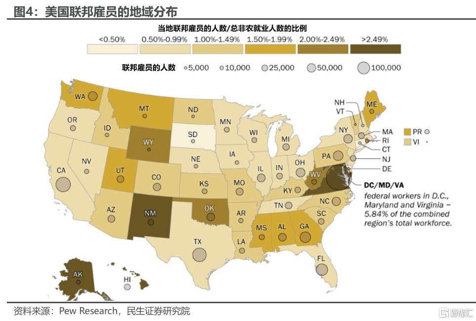 3)地域上十分分散,不仅是华盛顿DC。实际上,在DC特区以及毗邻的马里兰州和弗吉尼亚州工作的人共计只有19.6%;加州、德州的联邦雇员也较多、占比超过5%,甚至还有约3万人供职于海外。