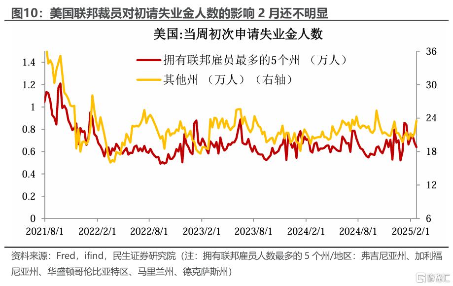 时间上,影响在2月或还不明显,可能从二季度至年末逐渐深入。首先,约7.5万联邦雇员接受了“买断计划”(即延期辞职),提前结束政府工作、继续拿工资到今年9月。9月前,这些人仍在工资单上,不会视为失业者。其次,按特朗普的计划,3-4月或有更大动作:白宫要求联邦机构3月13日前提交有关“大规模裁员”的计划、4月14日前改革组织架构。