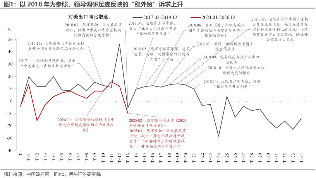 以2018年为参照,在中美贸易摩擦的背景下,领导调研足迹所反映的“稳外贸”诉求明显上升。今年两会后我们再次观察到相似信号,如3月18日至20日,李强总理在福建调研,提到“当前外贸形势严峻复杂”;3月23日在中国发展高层论坛上,总理提出“坚定不移推进开放合作”、“必要时推出新的增量政策”。