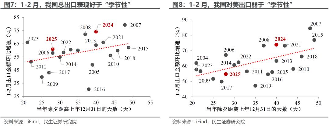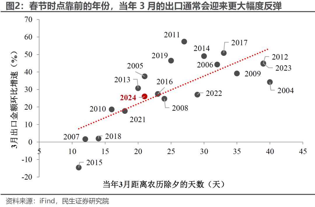 从历史来看,春节时点靠前往往会压低1-2月出口、抬高3月出口表现;由于今年是“早春”,3月出口可能会较1-2月明显回升(可参照2006、2014、2017年等春节时点与今年相近的年份,3月出口环比均为历史较高水平),并和去年形成“错位”(2024年恰好是“晚春”,3月出口环比较低),进一步放大出口同比读数。