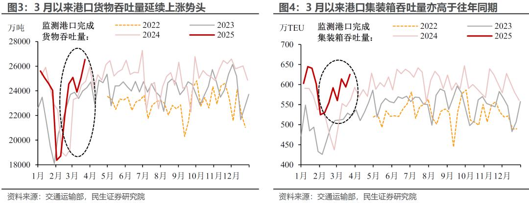 3月以来,我国监测港口货物吞吐量、集装箱吞吐量持续上升,表现好于往年同期水平。