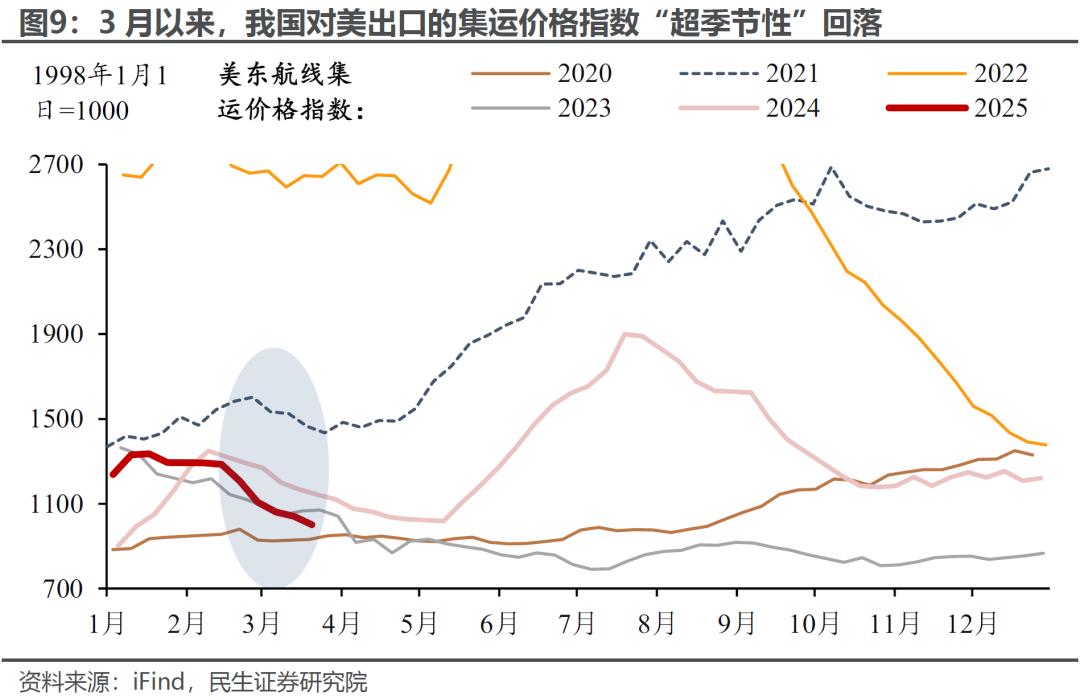 若剔除春节效应,今年1-2月的出口实际上略好于“季节性”,但对美出口表现弱于“季节性”,可能已部分反映了关税的影响。3月以来,以美东航线为代表的集装箱运价指数持续下滑,或进一步预示我国对美出口的景气回落。
