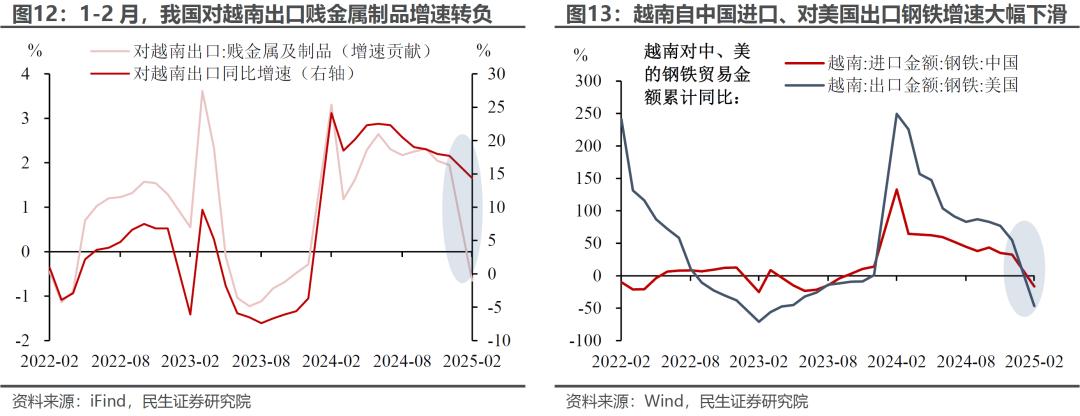今年2月,美国宣布对钢、铝产品普遍加征25%的关税,尽管我国已不再是美国主要的钢铁进口国、受到的直接影响有限,但间接打击了以东盟为代表的“转口”贸易伙伴。1-2月,我国对越南出口的贱金属及制品同比大幅降至-7.1%,为拖累最大的分项;从越南视角看,1-2月自我国进口钢铁、向美国出口钢铁同比分别下降16.6%、46.7%。
