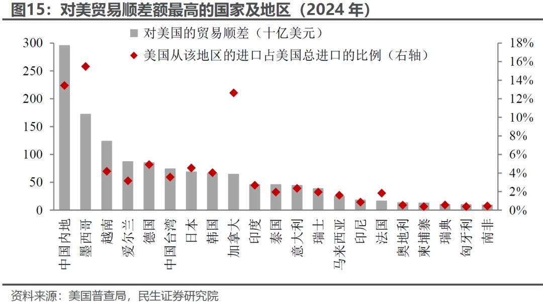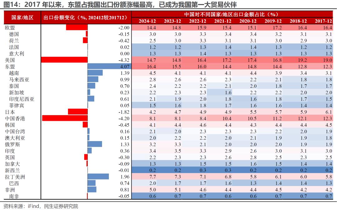 东盟已超越美、欧成为我国最大的贸易伙伴,2024年其占我国出口份额升至16.4%,高于美国、欧盟的14.7%、14.4%。从“高贸易顺差”的标准看,越南、马来西亚等东盟国家可能成为加征“对等关税”的对象。考虑到关税计算公式的高度不确定性,美国可能借此加大对于东盟的关税威胁、“转口”审查力度等。
