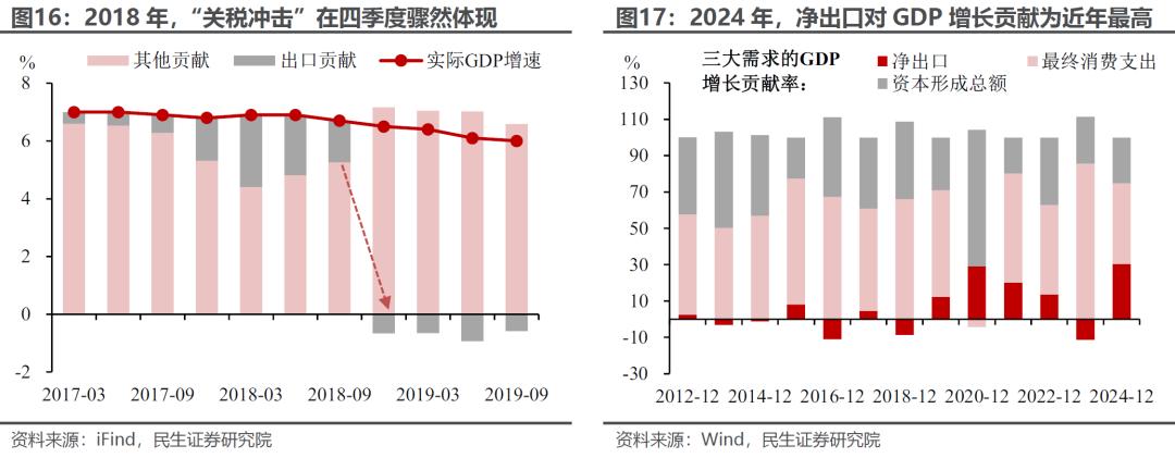 参考2018年经验,关税对于出口的冲击在四季度“显性化”,对当季实际GDP同比的拖累达0.66个百分点。我们在此前报告《关税翻倍:政策如何对冲?(民生宏观陶川团队)》中测算,已落地的20%关税对2025年实际GDP增长的拖累可能在0.49个百分点左右(尚未考虑美国对华进一步加征关税,以及打压“转口”贸易等),对应2至4季度平均每季的拖累幅度约0.67个百分点。为应对经济的下行风险,包括货币政策的阶段性宽松、财政政策追加特别国债等。