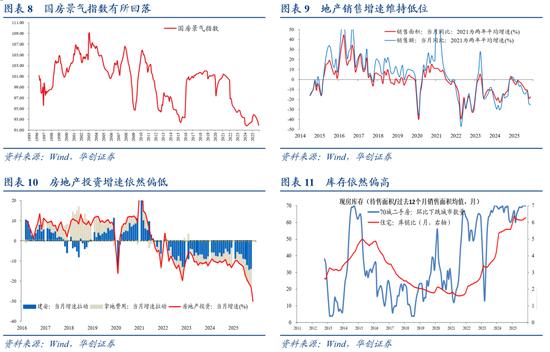 销售方面,11月商品房销售面积同比为-17.3%,10月为-18.8%。11月商品房销售额同比为-25.1%,10月为-24.3%。1-11月,商品房销售面积同比为-7.8%。投资方面,增速继续回落。11月,地产投资增速为-30.3%,10月为-23.0%。11月,新开工面积同比为-27.6%,10月为-29.5%。竣工面积11月同比为-25.5%,10月为-28.2%。施工面积,1-11月累计增速为-9.6%。资金来源方面,降幅有所扩大。11月地产资金来源增速为-32.5%,10月为-21.9%。其中,国内贷款,11月同比为-10.4%,前值为-6.7%。定金及预收款增速,11月为-41.9%,10月为-26.0%。个人按揭贷款增速,11月为-34.7%。自筹资金,11月同比增速为-30.7%。