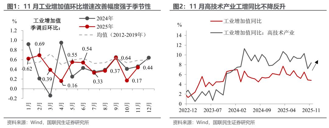 不过值得注意的是,11月高技术产业工增同比不降反升,这不仅与“高质量发展”的政策导向吻合,同时也说明了“反内卷”举措塑造了一个更规范、更注重长期创新的市场环境,有利于研发密集型产业释放活力。其全面效果仍需后续企业盈利、投资信心等数据进一步验证。