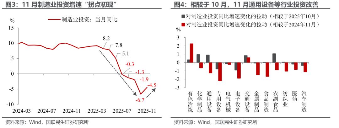 制造业:4月以来的“拐点初现”。自4月美国加征关税以来,制造业投资同比增速便处于下行通道,然而11月增速却从10月的-6.7%、小幅回升至-4.5%,一改往日的下行趋势,释放积极信号,我们认为制造业增速改善的主因在于出口下行压力的持续缓释。比如相较于10月,投资增速出现改善的制造业行业,主要也与出口挂钩,包括通用设备、交通设备等。