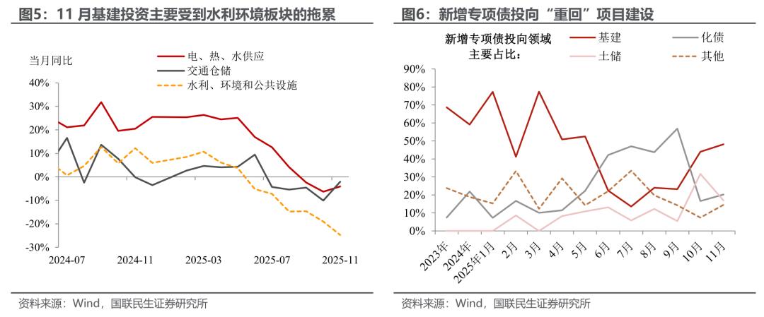 基建:“止跌回稳”正在路上。狭义基建投资增速从10月的-8.9%、进一步放缓至11月的-9.7%,主要受到水利、环境和公共设施板块的拖累。不过值得关注的是,近期新增专项债投向基建领域的比重已重拾升势,结合中央经济工作会议中“推动投资止跌回稳”的表述,基建投资的拐点可能已渐行渐近。