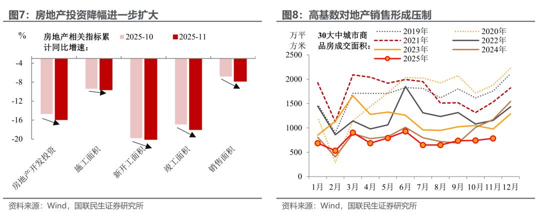 地产:基数抬升叠加需求偏弱,地产投资拐点未现。1-11月房地产投资累计增速加速回落至-15.9%(前值为-14.7%)。尽管11月商品房销售面积环比改善,但在去年政策效应释放的高基数下,同比降幅进一步走阔,需求端复苏动能仍相对偏缓。后续地产政策仍需以“防风险”为主要目标,通过“控增量、去库存、优供给”守住风险底线;并着力推动“好房子”建设,加快构建房地产发展新模式。