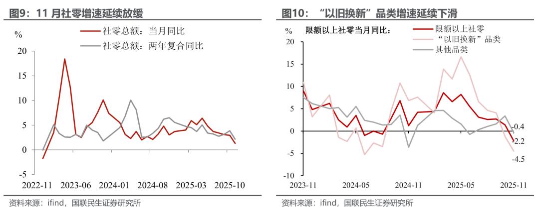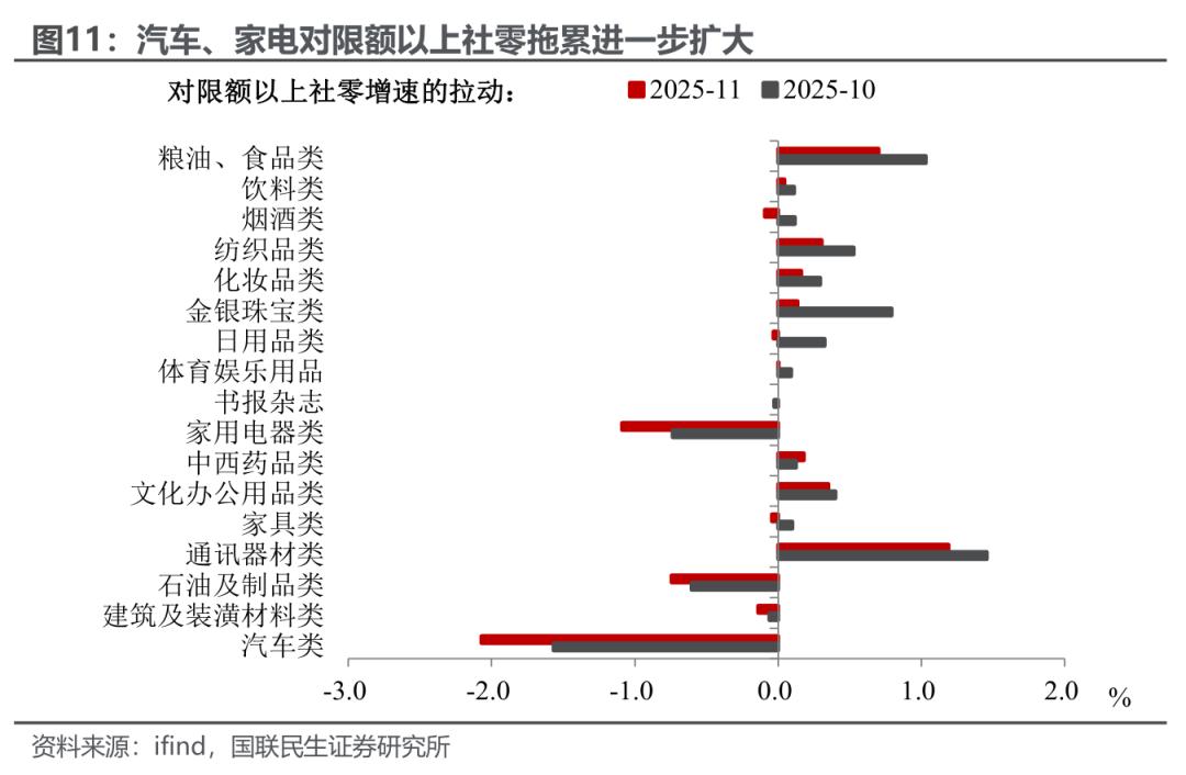 消费:促消费政策力度减弱叠加“双十一”前置影响,社零增速延续放缓。11月社零增速延续下行至1.3%,消费市场复苏节奏阶段性放缓。究其原因,一方面,受今年“双十一”促销活动前置的影响,10月部分消费需求集中释放,对11月社零增长形成分流;另一方面,临近年末,“国补”政策资金所剩无几,叠加去年同期基数较高的影响,前期“加力扩围”相关消费品增长动能延续回落。